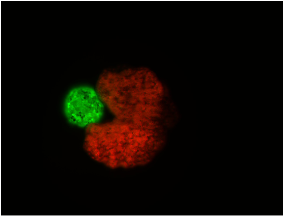 ai设计的吃豆人形状的“母体”生物(红色),旁边是被压缩成球状的干细胞——“后代”(绿色)。图片来源:道格拉斯•布莱克斯顿和山姆·克雷格曼