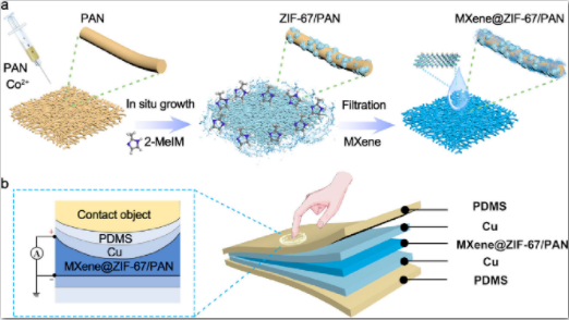 mxene/zif-67/pan制备及器件结构(a为mxene/zif-67/pan纳米纤维的示意图,b为mxene/zif-67/pan薄膜压力传感器的工作机理)
