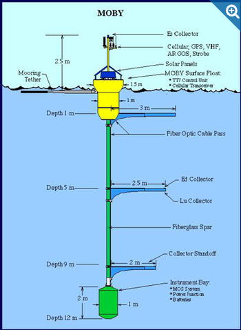 moby位于夏威夷拉奈海岸外20公里(12英里)处,因为该位置为海洋彩色卫星传感器的校准提供了最佳的大气和水条件。那里的海水作为世界其他海洋的代表,它清澈且叶绿素含量很低;大气也很清澈,几乎没有云,这确保了全球范围内测量的有效性。