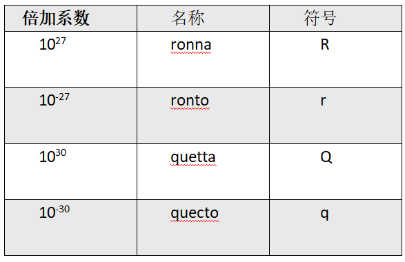 因此,国际计量单位制(si)增加了四个新的si前缀,覆盖了一个更广泛的范围,从而包括了: