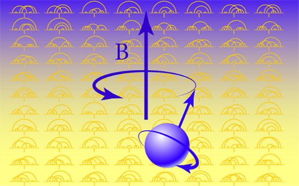 图1:在磁场(b)中旋转的电子的磁矩的测量可以用于测试标准模型。实验值和标准模型预测之间的差异可能会揭示模型中粒子或相互作用的缺失部分。图像背景代表了费曼图的一个子集,理论家们用它来计算电子的g因子,该因子将粒子的磁矩与其角动量相关联。