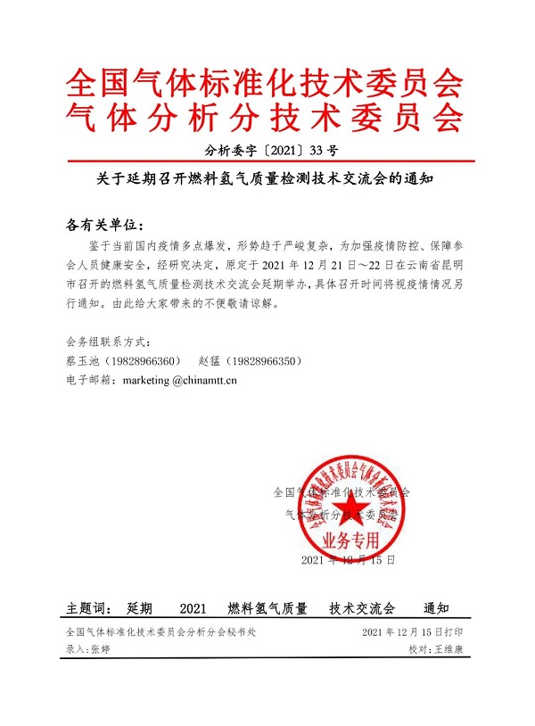 鉴于当前国内疫情多点爆发,形势趋于严峻复杂,为加强疫情防控、保障参会人员健康安全,经研究决定,原定于 2021年12月21日~22日在云南省昆明市召开的燃料氢气质量检测技术交流会延期举办,具体召开时间将视疫情情况另行通知。由此给大家带来的不便敬请谅解。