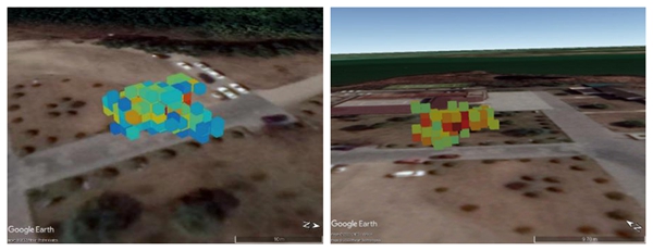 红外光谱成像检测技术是以ftir气体探测技术为基础的在线监测技术,具备监测距离远、监控范围广、灵敏度高、监测成分多等特点,可实现泄漏气云的成分甄别、柱浓度定量和图像呈现。徐亮团队在单台设备实现气云二维探测的基础上,架设了2台ag-ftir-gs3000型气体泄漏傅立叶红外光谱扫描仪,将多幅2d气云柱浓度图像与来自gps和陀螺仪传感器的精确定位信息相结合,运用计算机层析成像技术实现立体气云远距离定量重建,在数字地图上创建叠加气体云的3d图像。科研人员对约315立方米的空间中在两分钟内释放的少量六氟化硫和甲烷进行远程监测,生成具有两种气体的经纬度、高度和浓度分布的气体云的3d图像。该研究为泄漏成分分析、泄漏源精准定位和扩散态势评估提供了全新的技术路线。