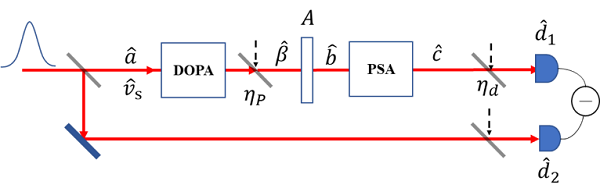 然而压缩态的低鲁棒性限制了它在复杂环境中的应用,且探测器的非理想探测效率也会导致其量子优势无法充分体现。对此,研究人员提出使用光参量放大器(opa)对微弱信号进行预放大来克服由于低探测效率引起的检测损失。由于存在量子涨落现象,经典放大器的放大过程会伴随着散粒噪声引入,导致噪声指数nf>3db。因此,突破这一固有限制是微弱信号精密测量亟需解决的重点与难点。