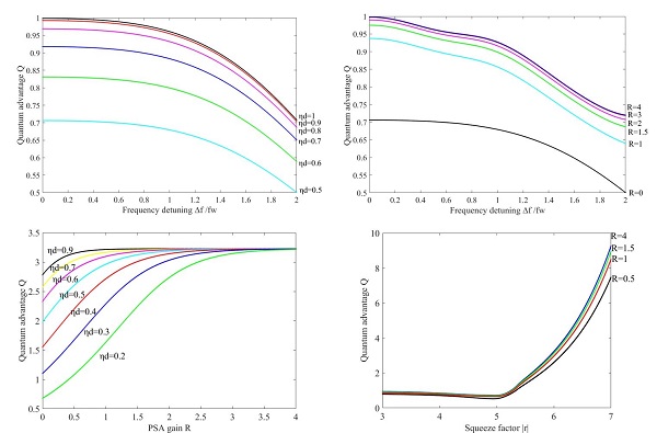 图2. 探测器检测效率,频率失谐量,压缩度和相位敏感增益等参数对系统量子优势的影响