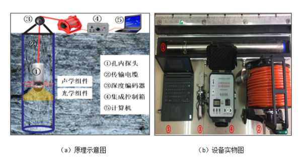 中国科学院武汉岩土力学研究所数字钻孔摄像技术组提出了钻孔孔壁声光组合式测量方法,运用钻孔声波扫描与钻孔光学影像同步采集并相互融合的解决思路,研发了基于钻孔声光组合式测量的岩体结构探测设备,实现了孔壁声学反射特性与光学影像特征的各自优势互为补充和互相印证,从而提高了岩体结构数据解译和判读的准确性和客观性。该方法以全方位声波脉冲反射序列数据和前视光学钻孔图像为主要数据来源,在考虑钻孔声学响应特征、几何轮廓特征、光学纹理特征、结构完整特征的基础上,建立了声光组合测量数据之间的映射关系与融合机制,形成了基于全脉冲声波扫描数据与钻孔前视光学图像的钻孔岩体结构三维建模与数据可视化方法,从而实现了融合钻孔周向和轴向的钻孔孔壁三维可视化过程,有助于钻孔各种演化阶段下的定性与定量描述,为钻孔岩体结构识别与分类提供了更多有效数据支撑。
