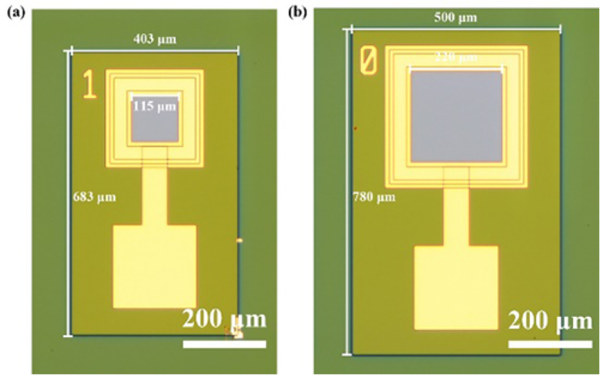 图2. 两种台面尺寸原型器件的光学显微镜图片(a)403 μm×683 μm(p1),(b)500 μm×780 μm(p0)。