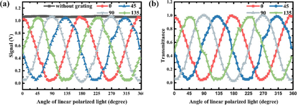 图5.(a)1550 nm下,无光栅器件和0°、 45°、90°和135°亚波长光栅器件的电学信号随入射光极化角度的变化关系;(b)光栅器件透射谱。