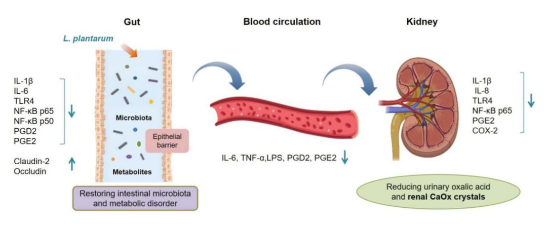 肾结石是泌尿系统最常见的疾病之一,草酸钙结石作为最常见的类型约占75%-90%,体外冲击波碎石术等手术治疗方法是目前消除结石的主要方法,尚无令人满意的药物来治愈或预防结石的复发。植物乳杆菌被多次报道不仅可在体外降解草酸,还可在体内降低尿草酸,减少肾结石。植物乳杆菌wcfsi是目前研究最多的乳酸菌之一,其重组菌株表现出草酸降解活性并通过分泌草酸脱羧酶降解草酸来抑制大鼠肾脏中草酸钙结石沉积。此外,最近的研究表明植物乳杆菌n-1和j-15也有较好的减少肾结石潜力,其不仅可改善肠道菌群失调,增强肠屏障功能,还可减轻局部炎症。
